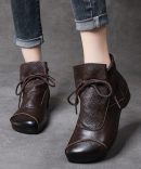 Simple Brown Cowhide Leather Boots Lace Up Splicing Ankle Boots